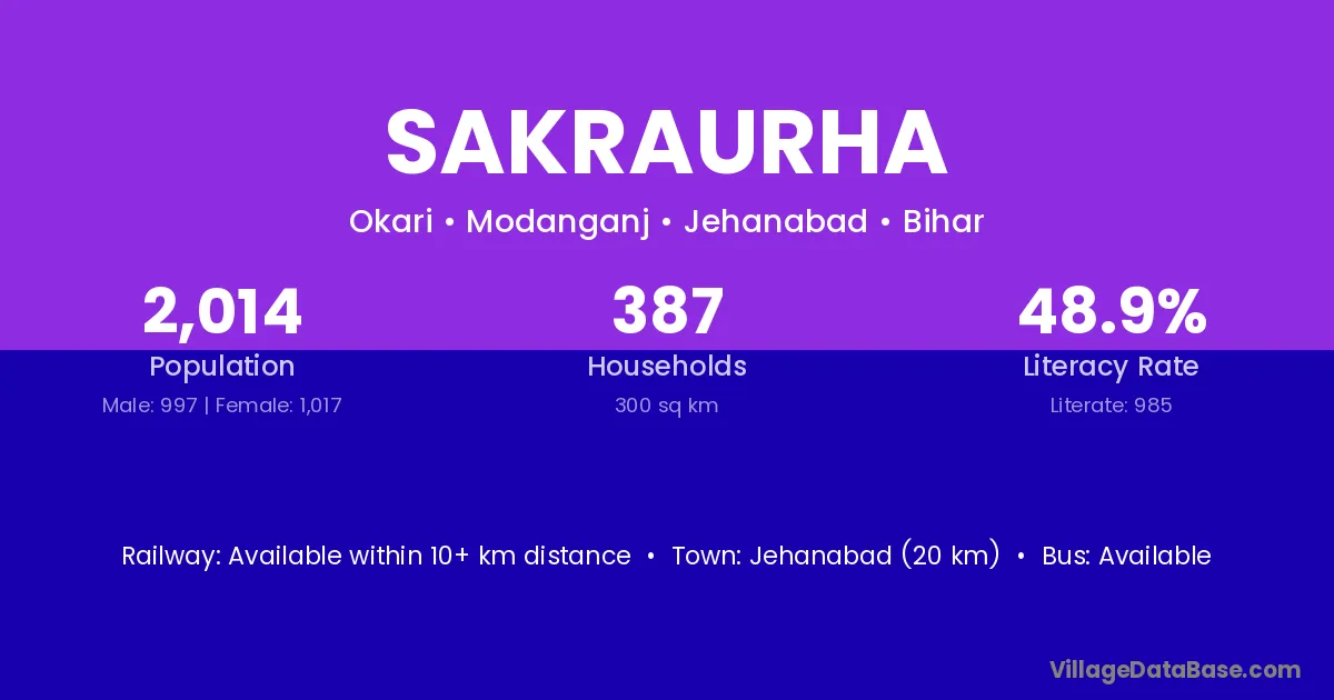 Jehanabad (20 km) is the nearest town to Sakraurha village for major economic activities and is located approximately 20 km away.