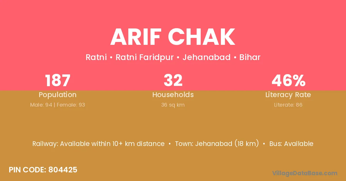 Jehanabad (18 km) is the nearest town to Arif Chak village for major economic activities and is located approximately 18 km away.