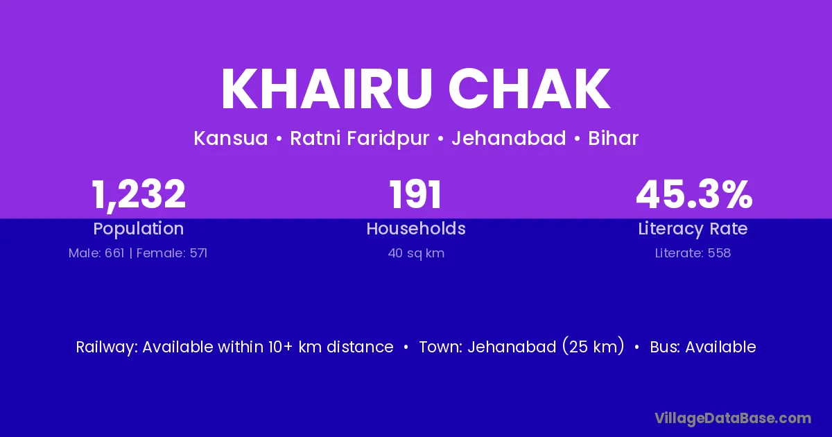 Jehanabad (25 km) is the nearest town to Khairu Chak village for major economic activities and is located approximately 25 km away.