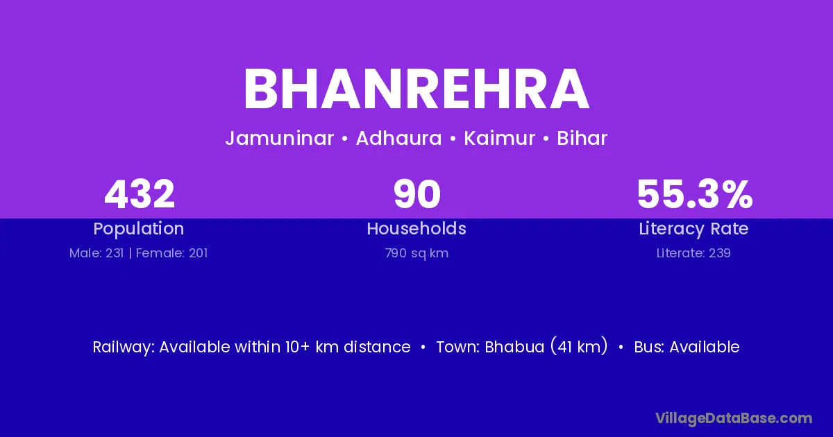 Bhabua (41 km) is the nearest town to Bhanrehra village for major economic activities and is located approximately 41 km away.