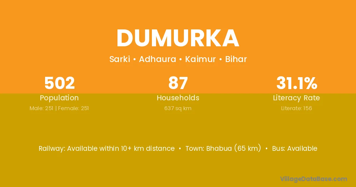 Bhabua (65 km) is the nearest town to Dumurka village for major economic activities and is located approximately 65 km away.