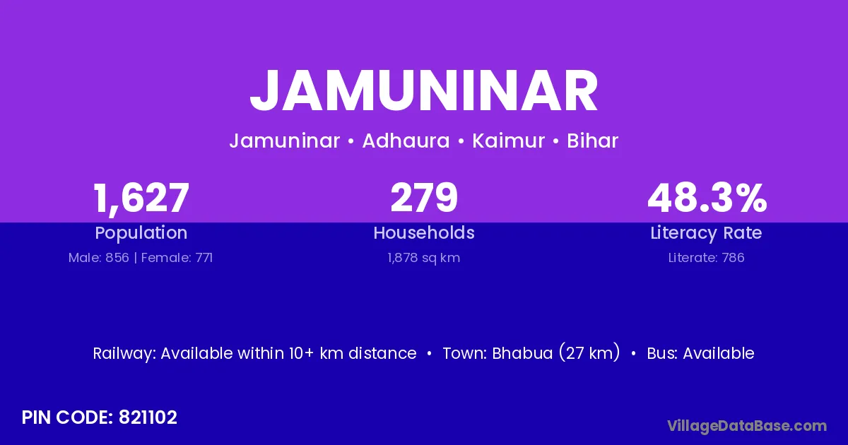 Bhabua (27 km) is the nearest town to Jamuninar village for major economic activities and is located approximately 27 km away.