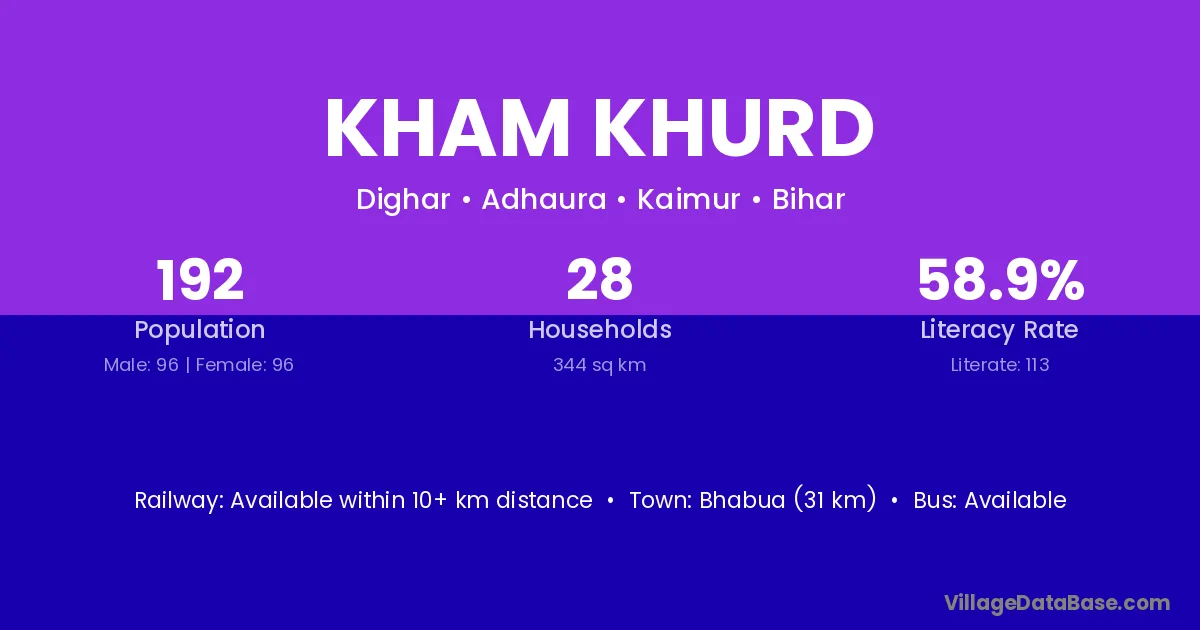 Kham Khurd village has a total population of 192 people, of which 96 are males and 96 are females.