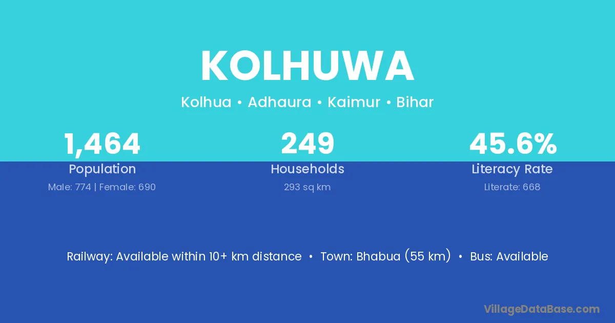 Bhabua (55 km) is the nearest town to Kolhuwa village for major economic activities and is located approximately 55 km away.