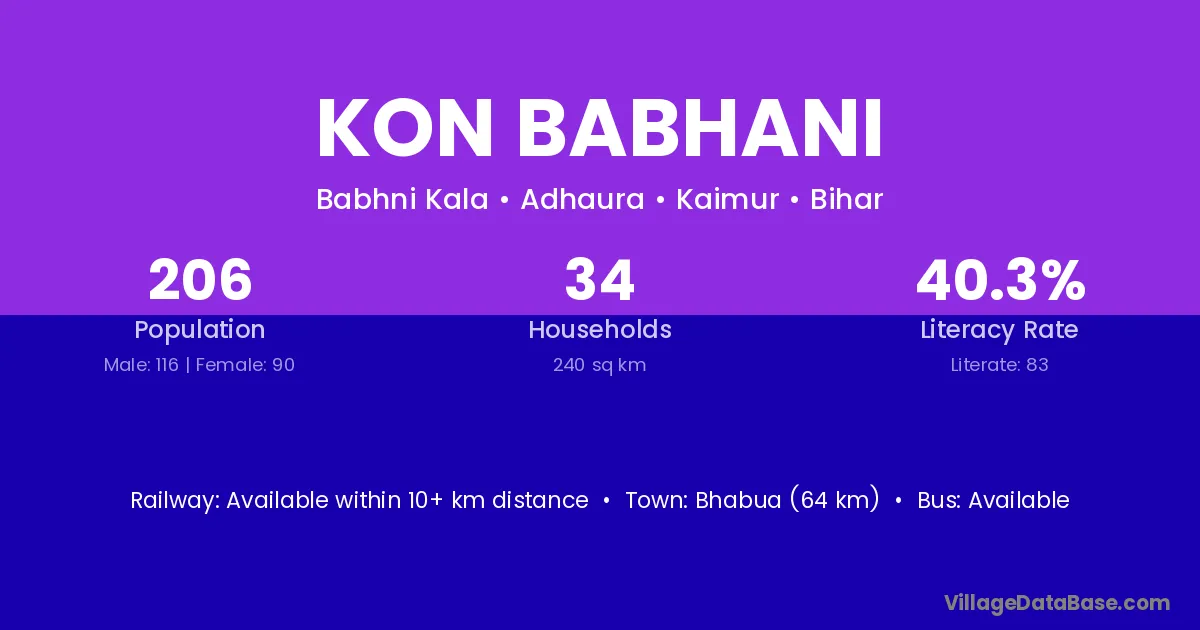 Bhabua (64 km) is the nearest town to Kon Babhani village for major economic activities and is located approximately 64 km away.