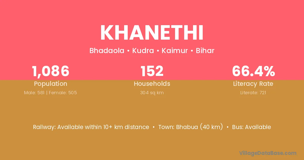 Bhabua (15 km) is the nearest town to Khanethi village for major economic activities and is located approximately 15 km away.
