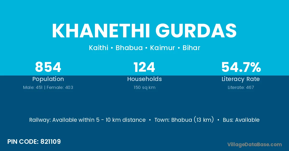 Bhabua (13 km) is the nearest town to Khanethi Gurdas village for major economic activities and is located approximately 13 km away.