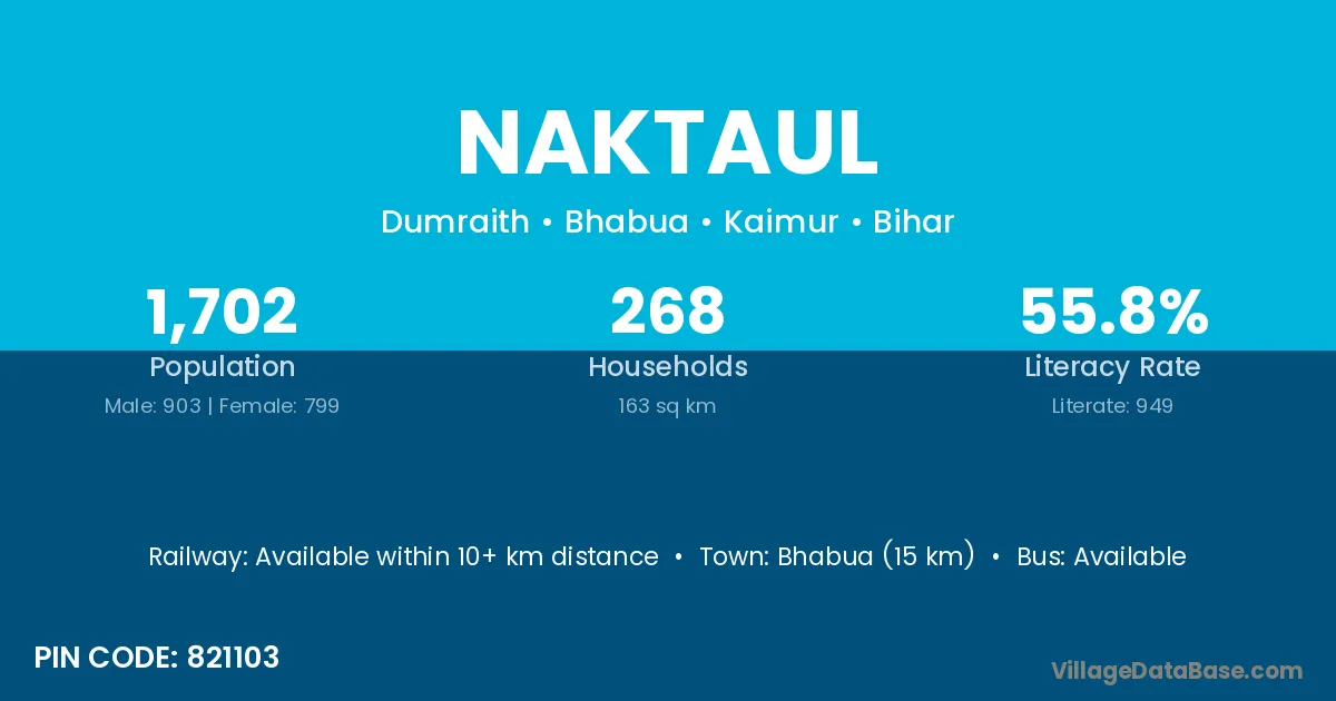 Bhabua (15 km) is the nearest town to Naktaul village for major economic activities and is located approximately 15 km away.