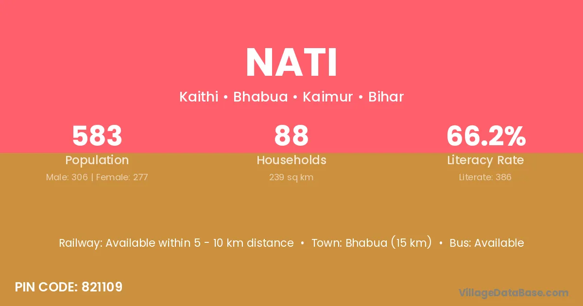Bhabua (15 km) is the nearest town to Nati village for major economic activities and is located approximately 15 km away.