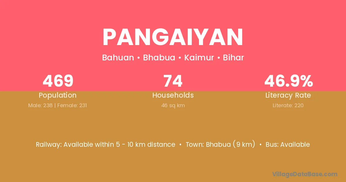 Pangaiyan village has a total population of 469 people, of which 238 are males and 231 are females.