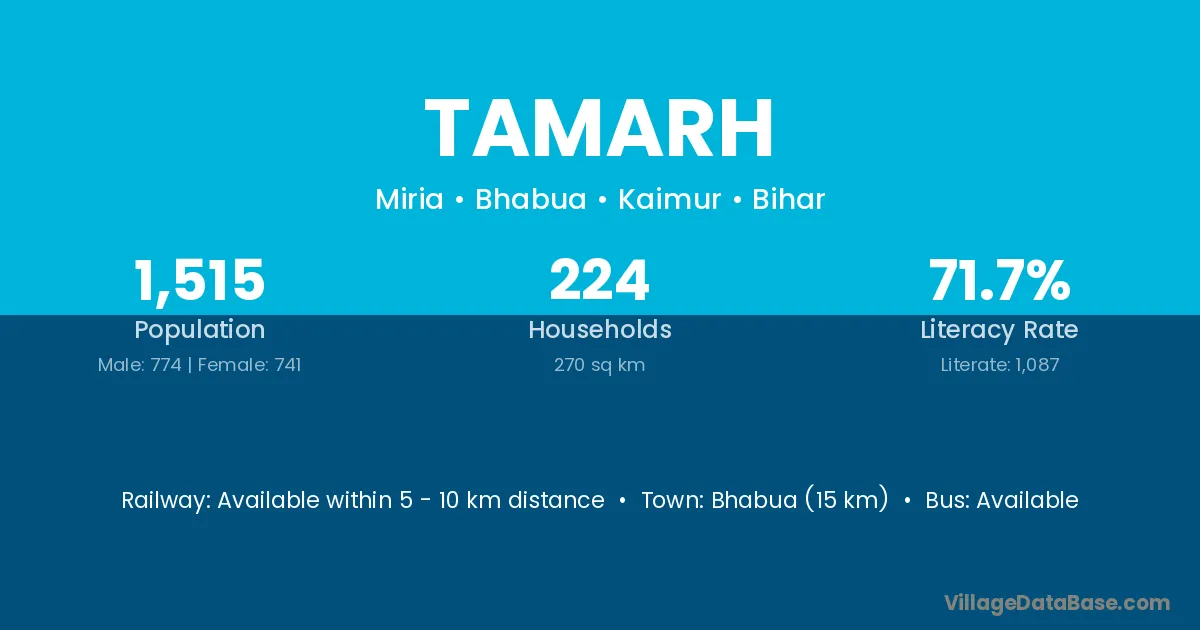 Bhabua (15 km) is the nearest town to Tamarh village for major economic activities and is located approximately 15 km away.