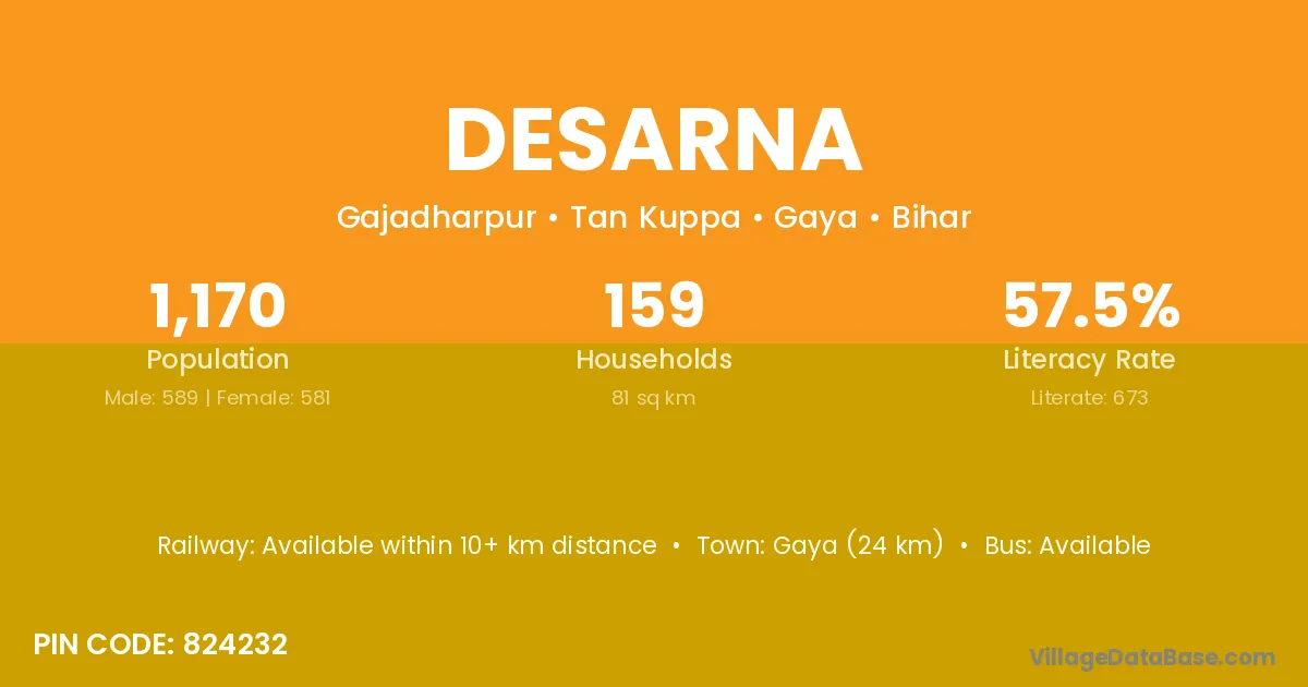 Bhabua (14 km) is the nearest town to Desarna village for major economic activities and is located approximately 14 km away.