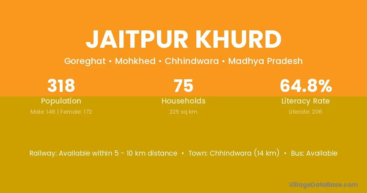 Jaitpur Khurd village has a total population of 33 people, of which 18 are males and 15 are females.