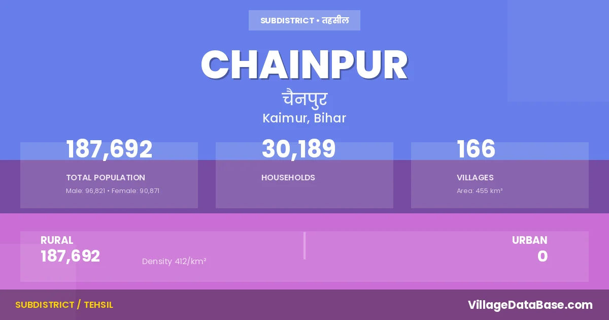 Chainpur is a town and Subdivision in the Kaimur district of the Bihar. In India, a Subdivision is a subdivision of a district responsible for the administration and revenue collection of a specific area within the district. Subdivisions play a crucial role in the local governance structure, contributing significantly to the development and administration of their communities.