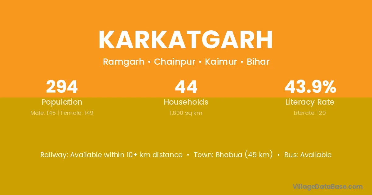 Bhabua (45 km) is the nearest town to Karkatgarh village for major economic activities and is located approximately 45 km away.