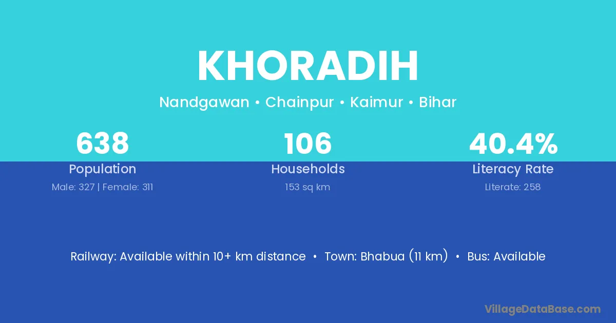 Bhabua (11 km) is the nearest town to Khoradih village for major economic activities and is located approximately 11 km away.