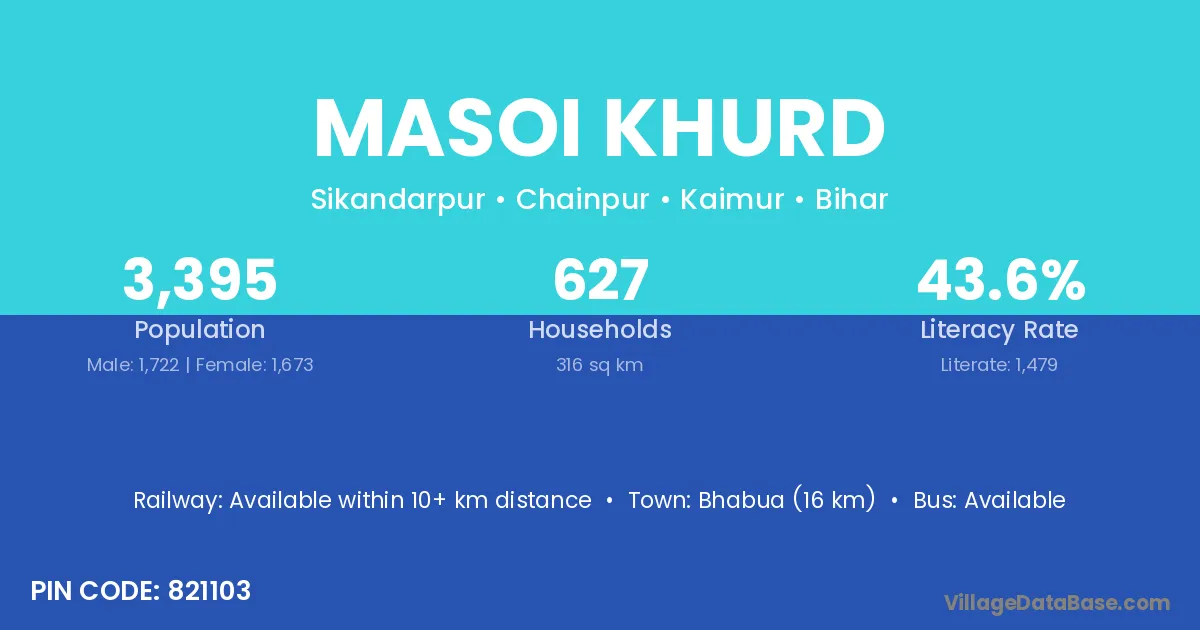 Bhabua (16 km) is the nearest town to Masoi Khurd village for major economic activities and is located approximately 16 km away.