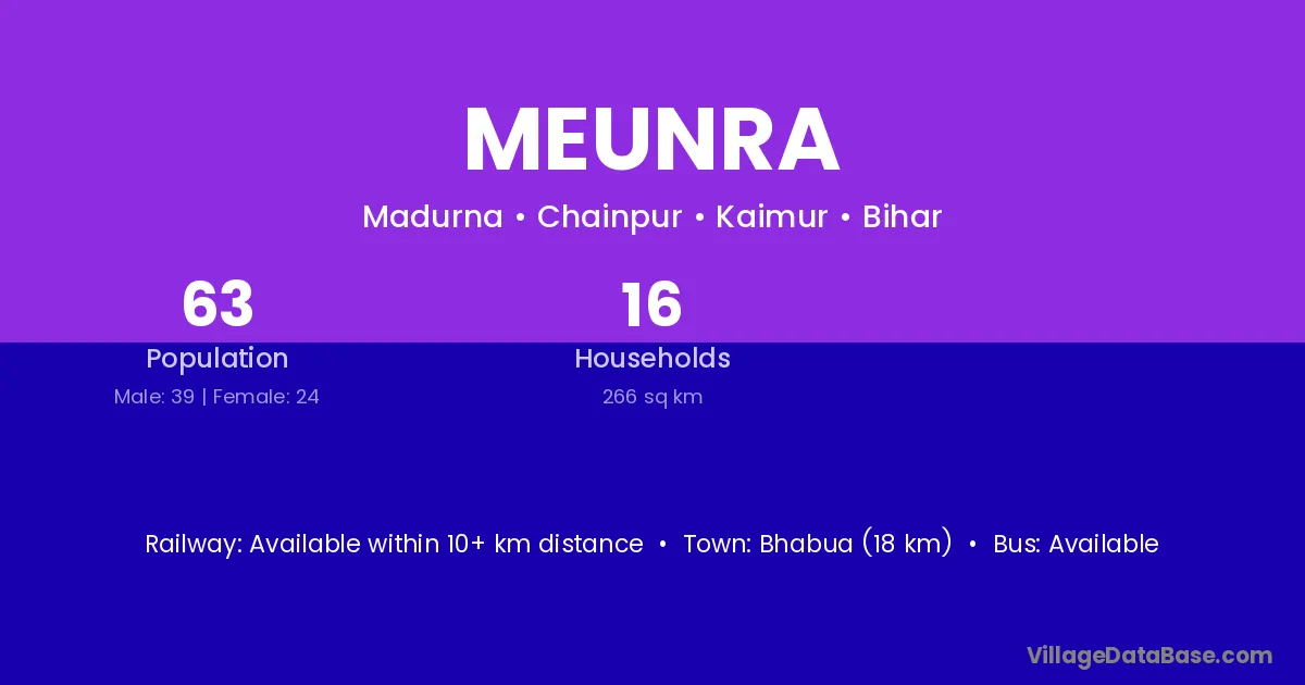 Bhabua (18 km) is the nearest town to Meunra village for major economic activities and is located approximately 18 km away.