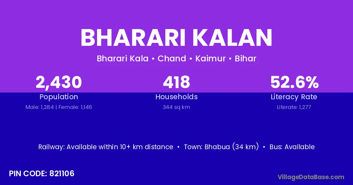 Bhabua (34 km) is the nearest town to Bharari Kalan village for major economic activities and is located approximately 34 km away.