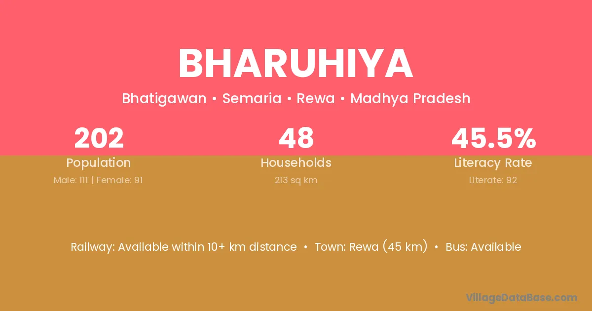 Bhabua (29 km) is the nearest town to Bharuhiya village for major economic activities and is located approximately 29 km away.