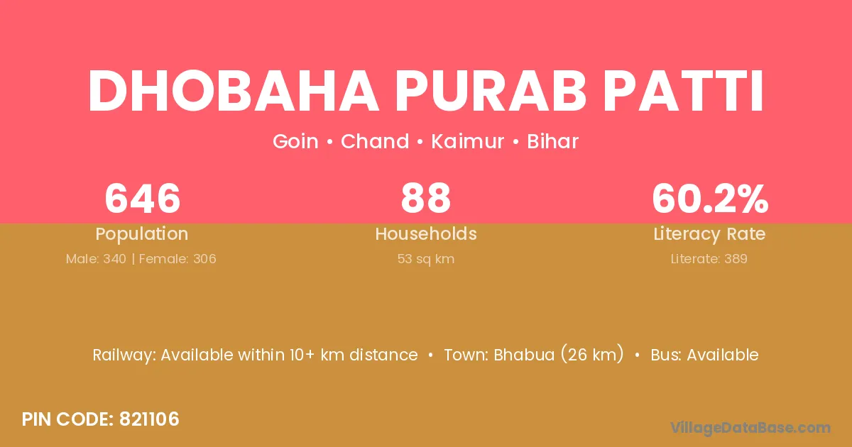 Bhabua (26 km) is the nearest town to Dhobaha Purab Patti village for major economic activities and is located approximately 26 km away.