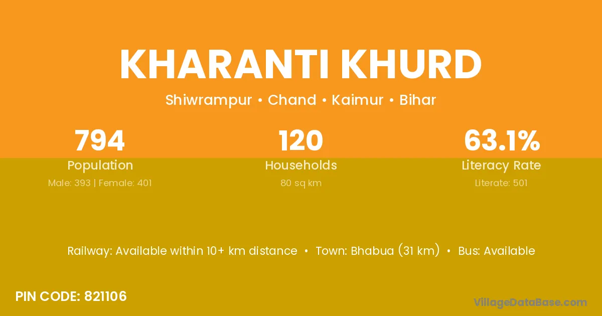 Bhabua (31 km) is the nearest town to Kharanti Khurd village for major economic activities and is located approximately 31 km away.