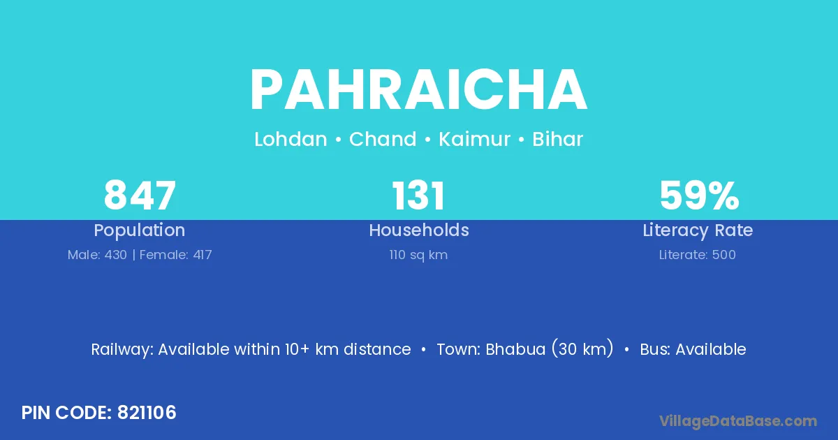 Bhabua (30 km) is the nearest town to Pahraicha village for major economic activities and is located approximately 30 km away.
