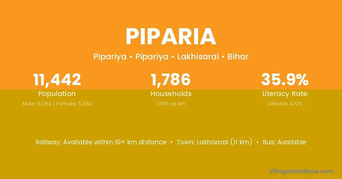 The literacy rate of Piparia village is 65.48%. Male literacy stands at 66.95% and female literacy at 63.95%.