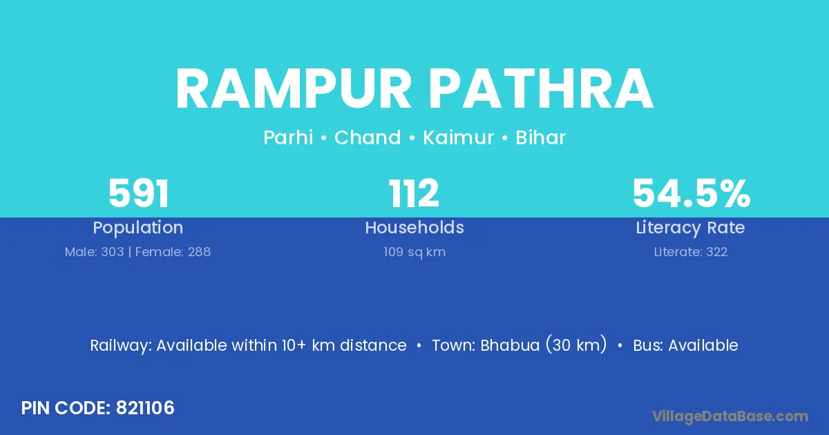 Bhabua (30 km) is the nearest town to Rampur Pathra village for major economic activities and is located approximately 30 km away.