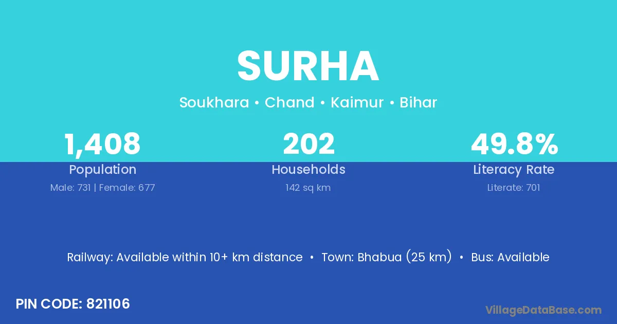 Bhabua (25 km) is the nearest town to Surha village for major economic activities and is located approximately 25 km away.