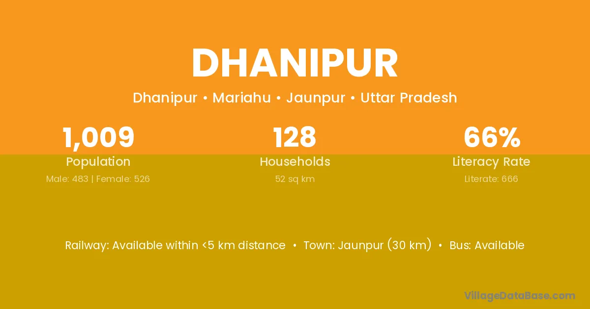 Bhabua (36 km) is the nearest town to Dhanipur village for major economic activities and is located approximately 36 km away.