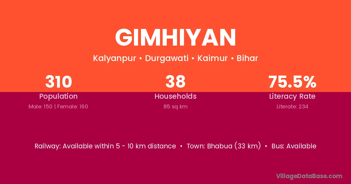 Bhabua (33 km) is the nearest town to Gimhiyan village for major economic activities and is located approximately 33 km away.