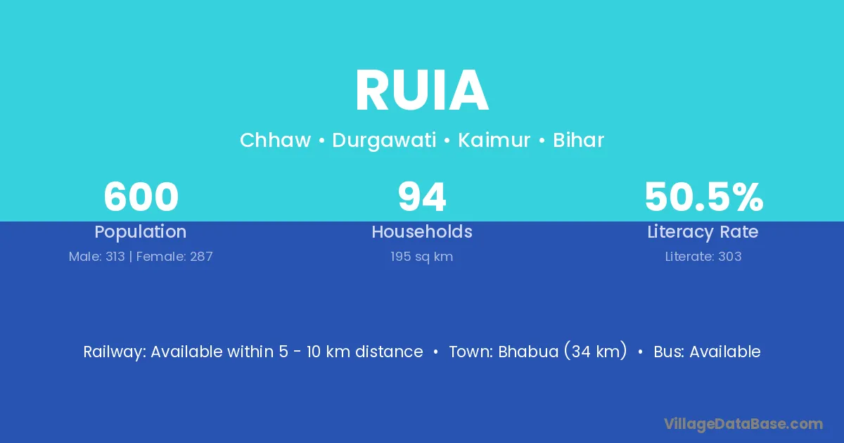 Bhabua (34 km) is the nearest town to Ruia village for major economic activities and is located approximately 34 km away.