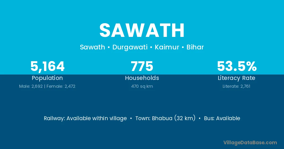 Bhabua (32 km) is the nearest town to Sawath village for major economic activities and is located approximately 32 km away.