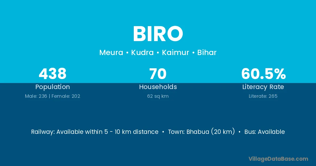 Bhabua (20 km) is the nearest town to Biro village for major economic activities and is located approximately 20 km away.