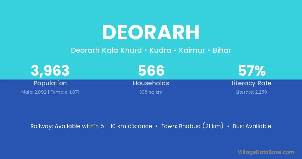 Bhabua (21 km) is the nearest town to Deorarh village for major economic activities and is located approximately 21 km away.