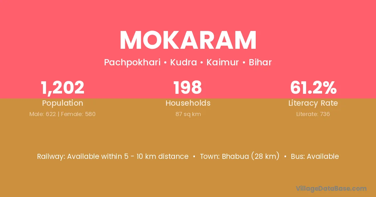 Bhabua (28 km) is the nearest town to Mokaram village for major economic activities and is located approximately 28 km away.