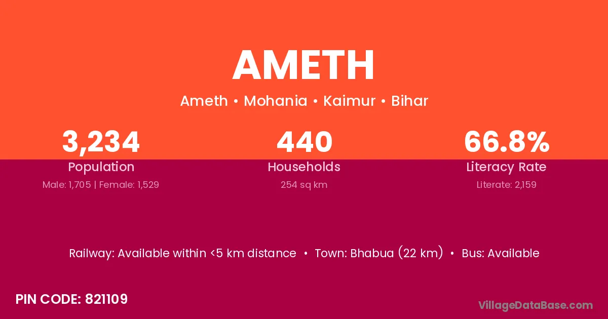 Bhabua (22 km) is the nearest town to Ameth village for major economic activities and is located approximately 22 km away.