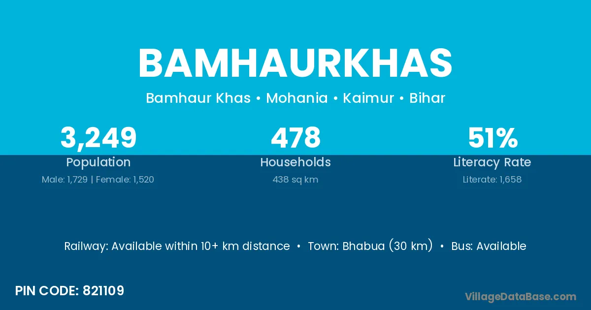 Bhabua (30 km) is the nearest town to Bamhaurkhas village for major economic activities and is located approximately 30 km away.