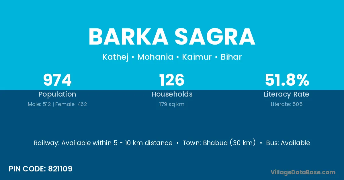 Bhabua (30 km) is the nearest town to Barka Sagra village for major economic activities and is located approximately 30 km away.