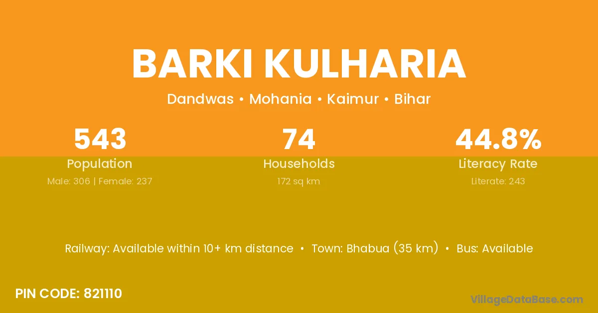 Bhabua (35 km) is the nearest town to Barki Kulharia village for major economic activities and is located approximately 35 km away.