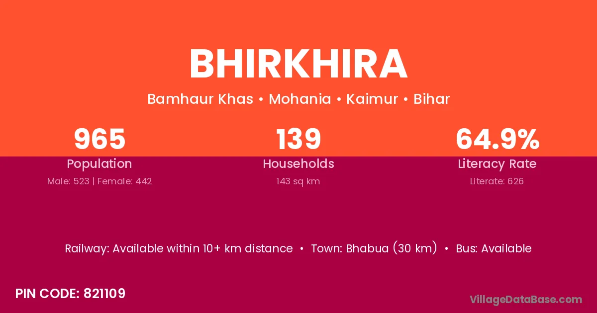 Bhabua (30 km) is the nearest town to Bhirkhira village for major economic activities and is located approximately 30 km away.