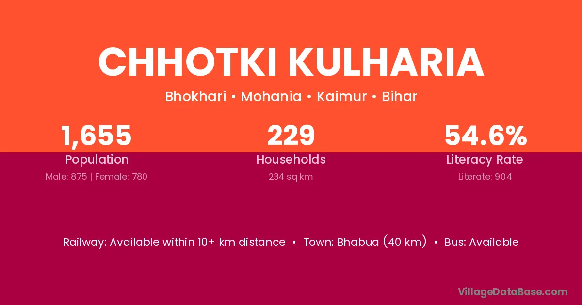 Bhabua (40 km) is the nearest town to Chhotki Kulharia village for major economic activities and is located approximately 40 km away.