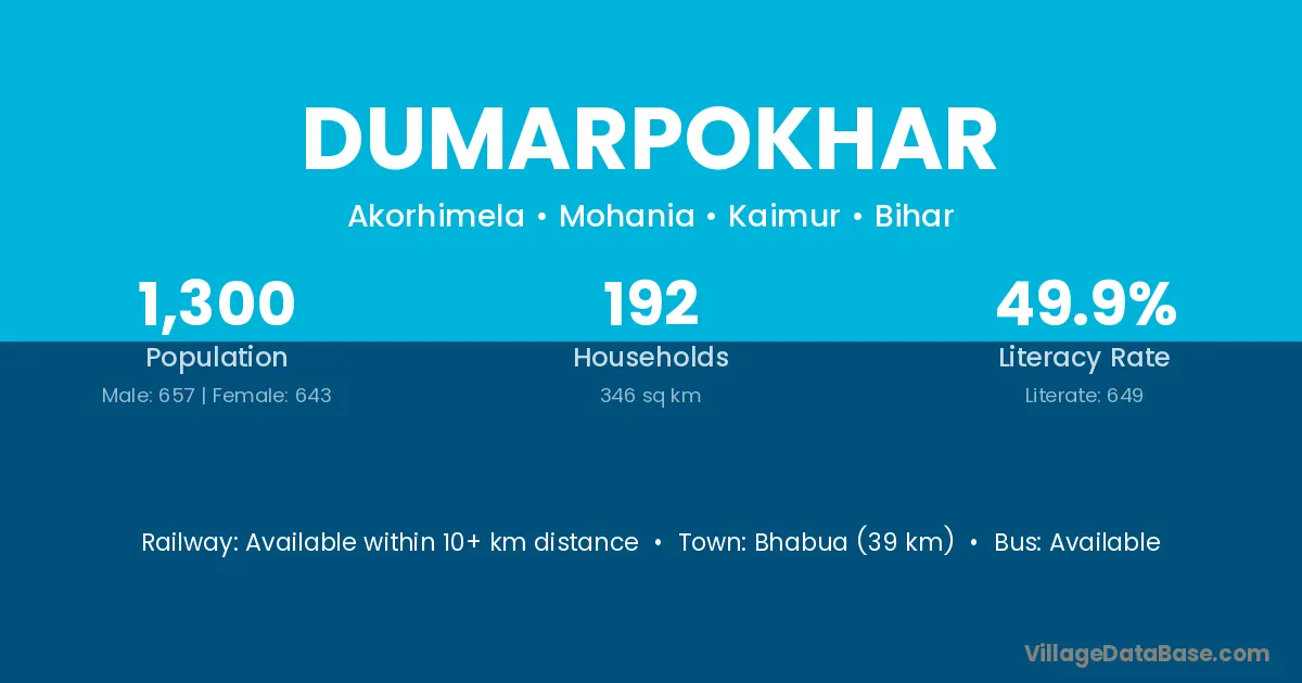 Bhabua (39 km) is the nearest town to Dumarpokhar village for major economic activities and is located approximately 39 km away.