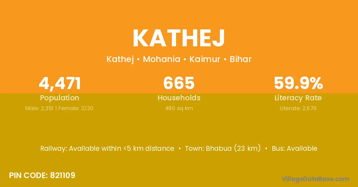 Bhabua (23 km) is the nearest town to Kathej village for major economic activities and is located approximately 23 km away.