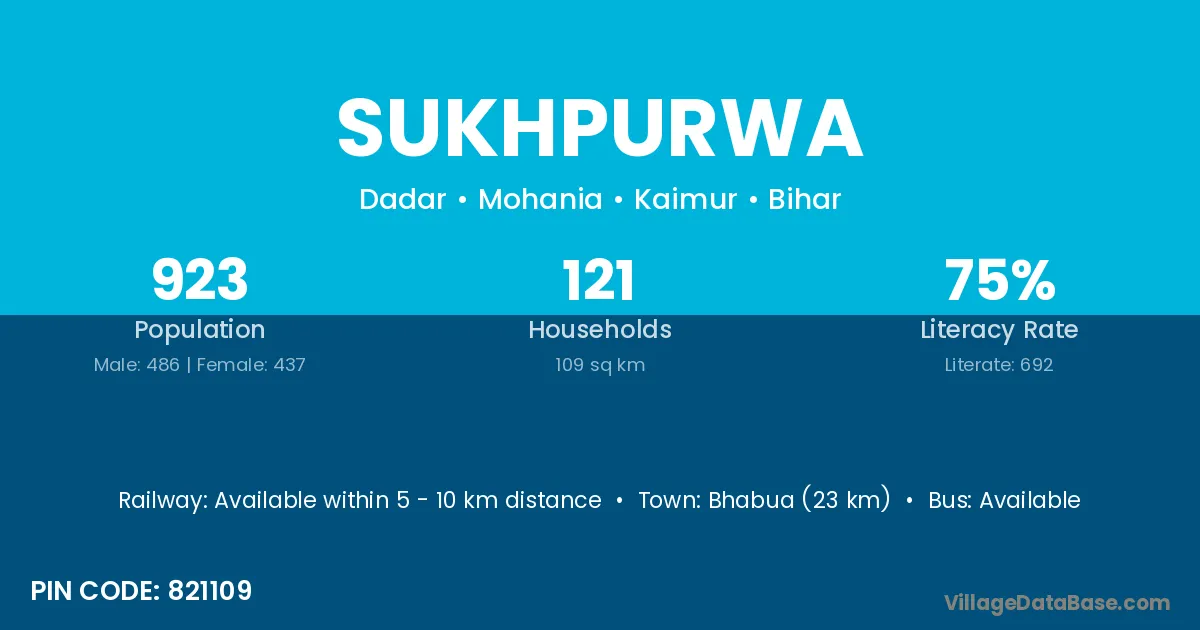 Bhabua (23 km) is the nearest town to Sukhpurwa village for major economic activities and is located approximately 23 km away.