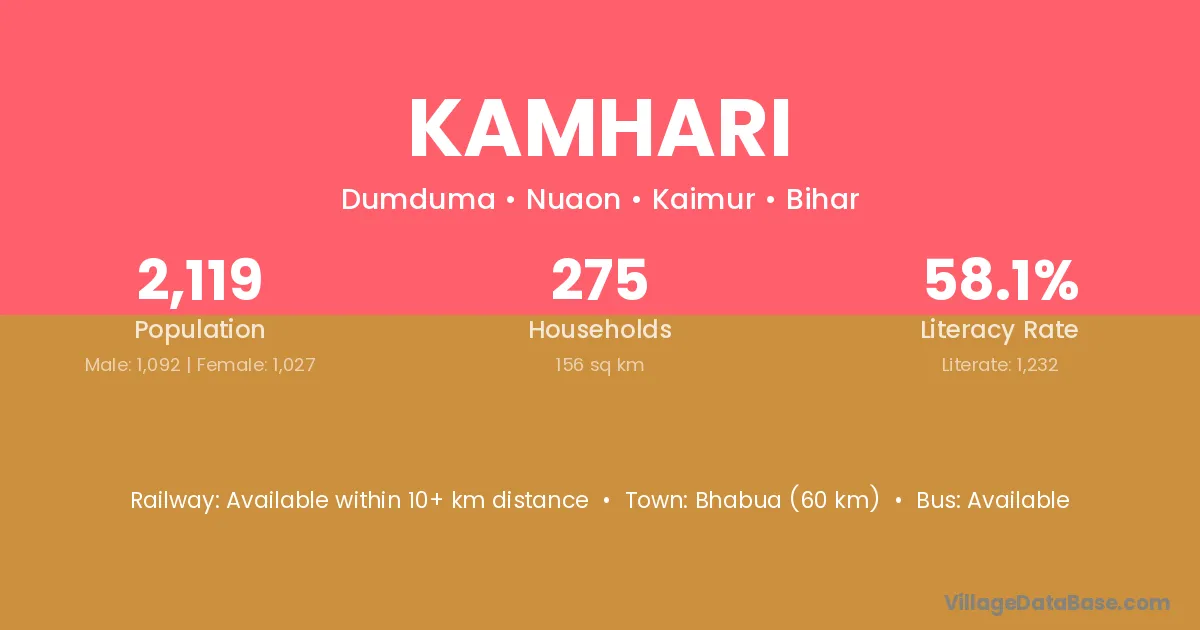 Bhabua (60 km) is the nearest town to Kamhari village for major economic activities and is located approximately 60 km away.