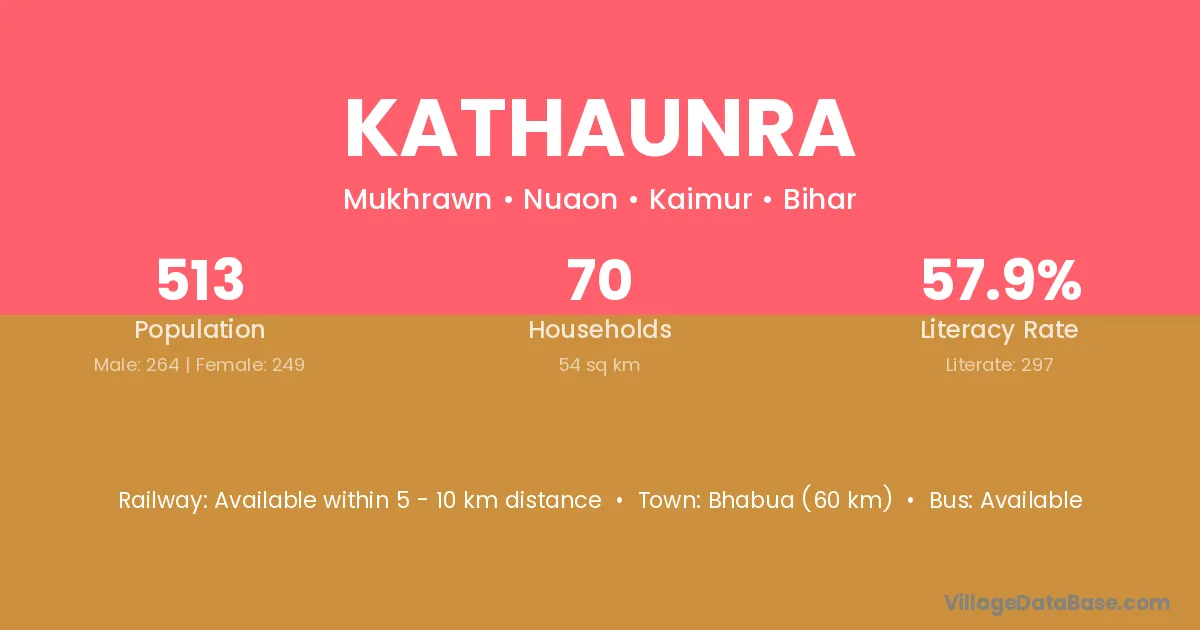 Bhabua (60 km) is the nearest town to Kathaunra village for major economic activities and is located approximately 60 km away.