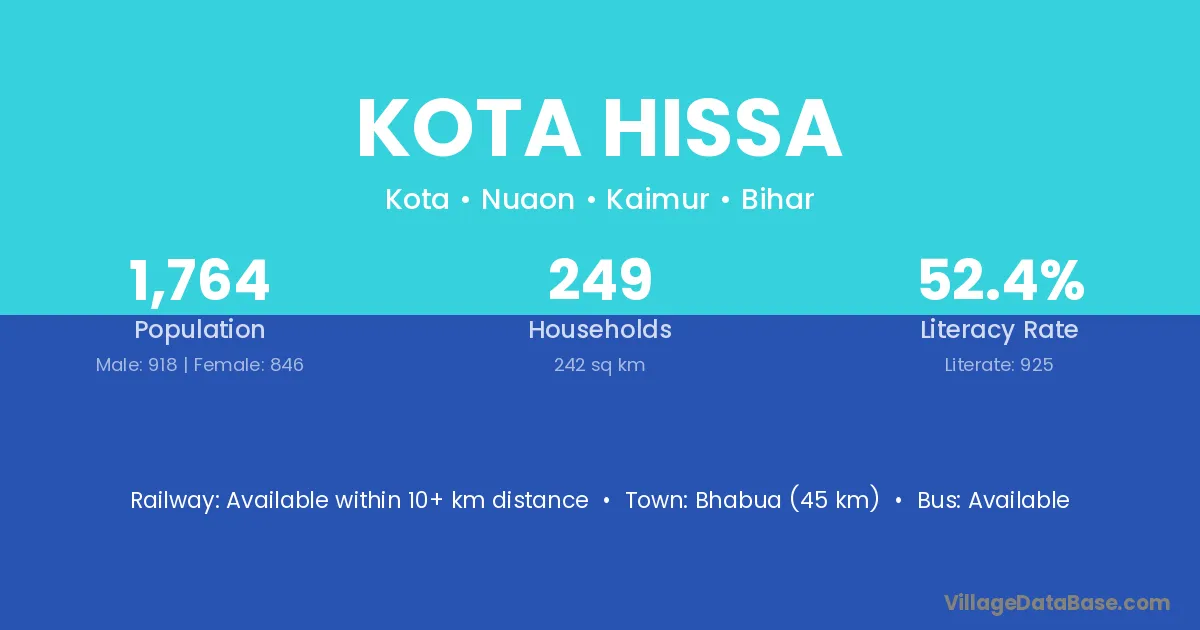 Bhabua (45 km) is the nearest town to Kota Hissa village for major economic activities and is located approximately 45 km away.