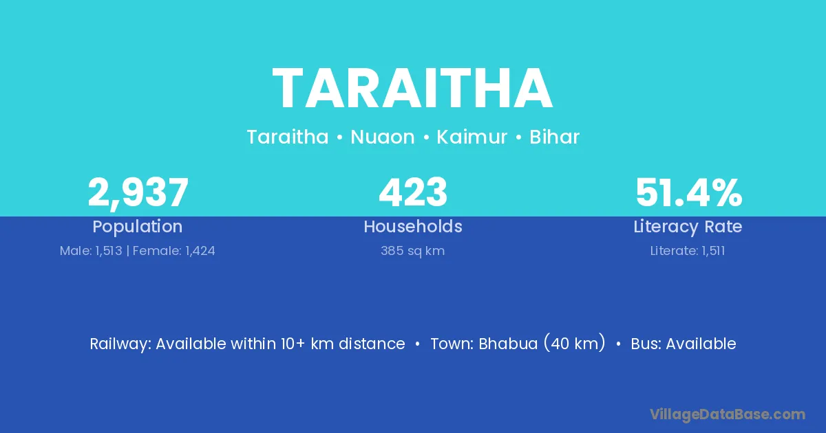 Bhabua (40 km) is the nearest town to Taraitha village for major economic activities and is located approximately 40 km away.